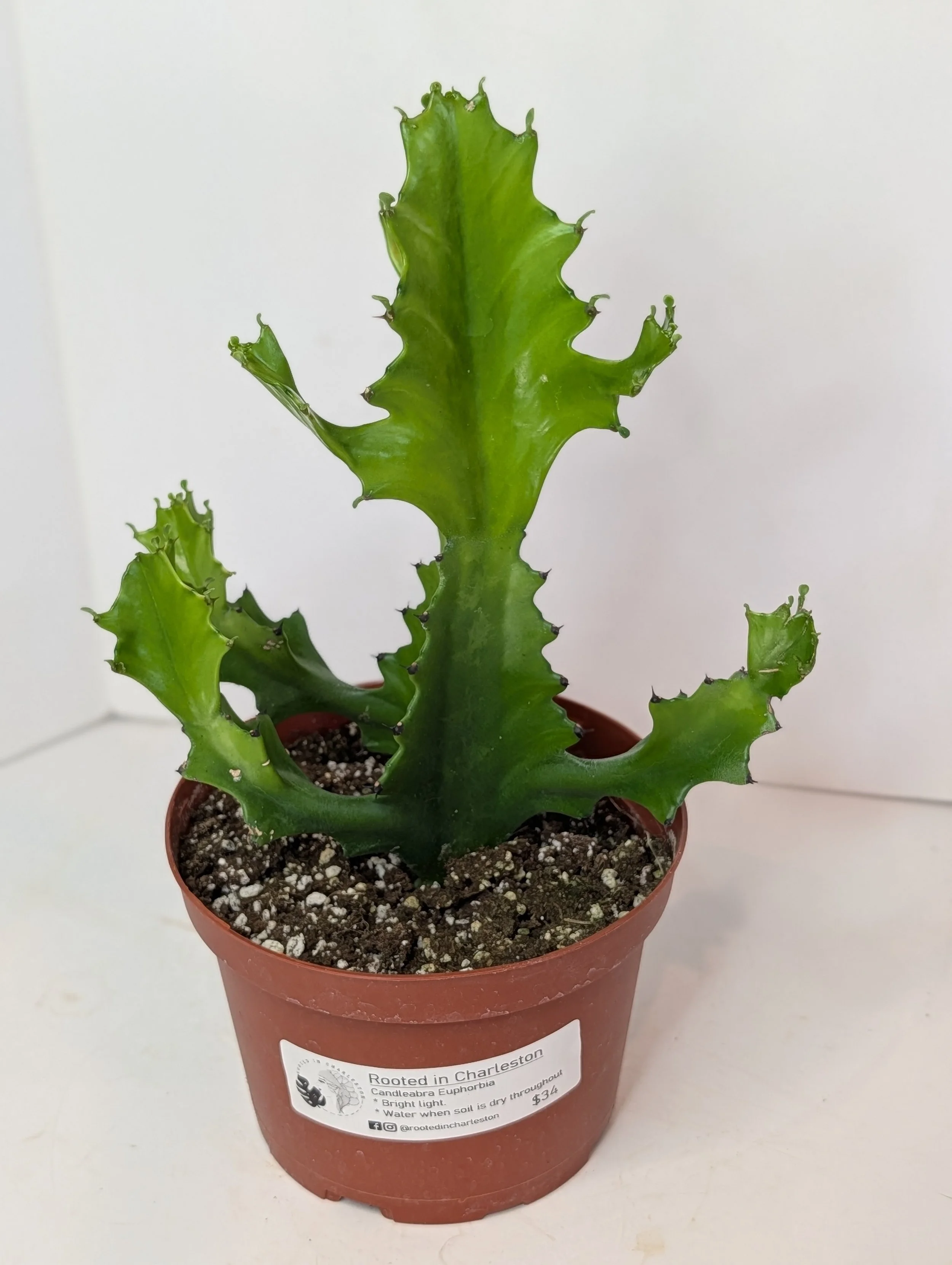 Image 1 of 3 Image 2 of 3 Image 3 of 3 Candleabra Euphorbia $34.00 6” pot.Bright light.Water well when the soil is dry most of the way through the pot. Add To Cart Added! 6” pot.Bright light.Water well when the soil is dry most of the way through the pot.