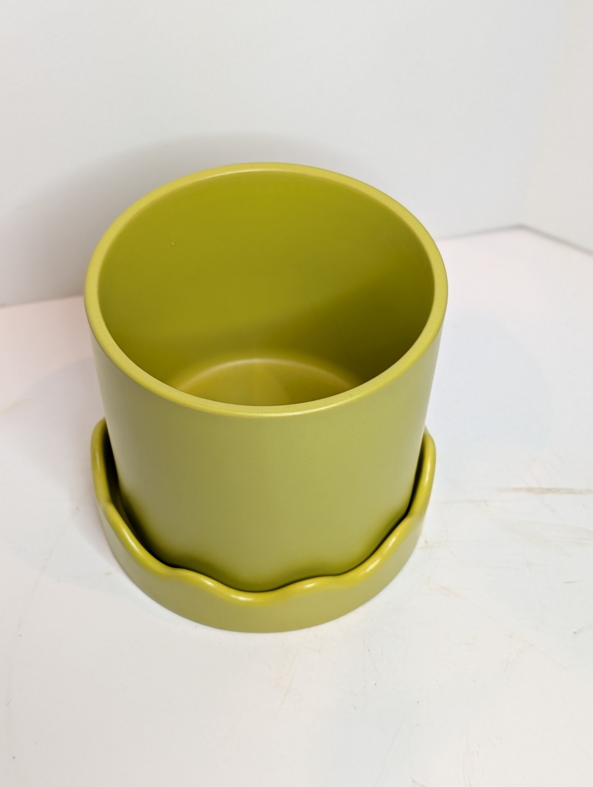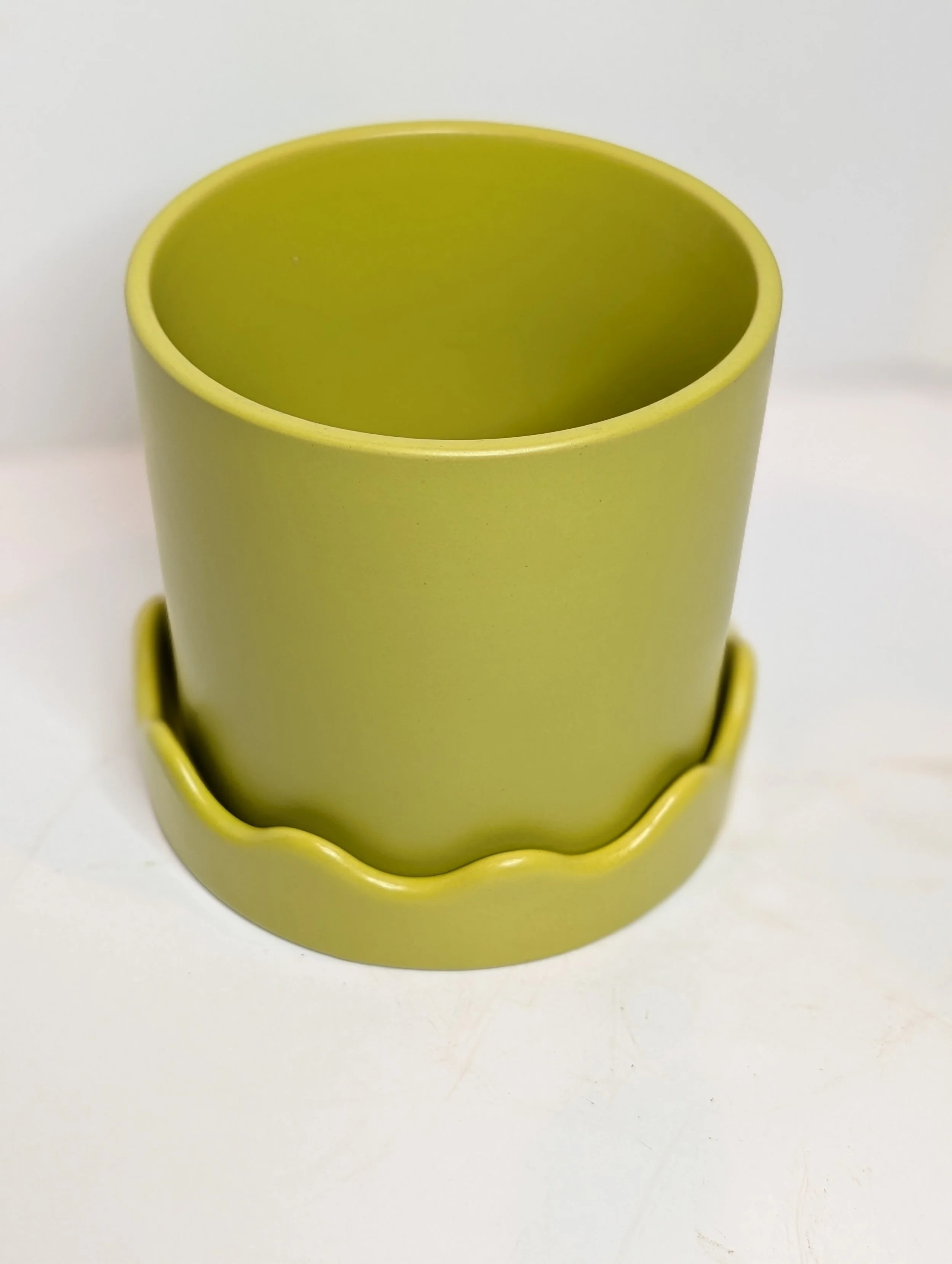 Image 1 of 2 Image 2 of 2 Chartreuse Planter $24.00 6” ceramic planter with saucer. Has drainage. Quantity: Add To Cart Added! 6” ceramic planter with saucer. Has drainage.